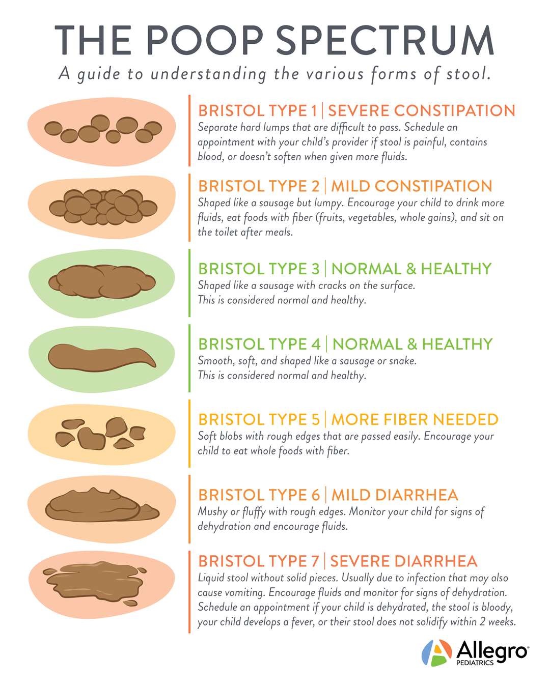 For children 5 months and older, contact your PCP if your child has infrequent stools (less than 2 times per week consistently), experiences stomach pain when pooping, has stools that clog the toilet, experiences repeated bouts of constipation (stools persistently Bristol type 1-2), strains/pushes for a long time to get their stool to pass, especially if you see a hemorrhoid or abdominal distension, or you see traces of liquid stool in your child’s underwear, a sign that stool is backed up in the rectum and leaking around the blockage.
